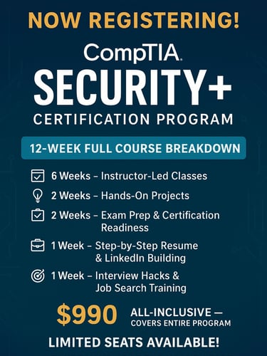 I had no prior IT experience, but after taking the CompTIA Security+ class and earning my certification, everything changed. Biruk helped me build a strong resume, set up my LinkedIn, and coached me on how to ace interviews. Just three months after starting the class, I got hired as a Junior SOC Analyst—thank you, Biruk!